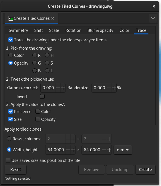 A window will appear. In this window, go to the Trace tab. The only thing you should have to change here is selecting Opacity under option 1.