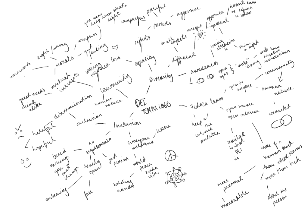 I start with taking out a piece of paper, or a drawing tablet if you prefer, and start jotting down a brainstorm / spider map. Start with the keywords ‘DEI team’, and work out the way. What words do you associate with it? Write them down, and then start asking yourself what words do you associate with the associated words. Keep going until the page is filled with different words / phrases. You can add in quick sketches too, whatever you can to make you think of more things. Your page should look something like (or nothing like) this at the end of the exercise: