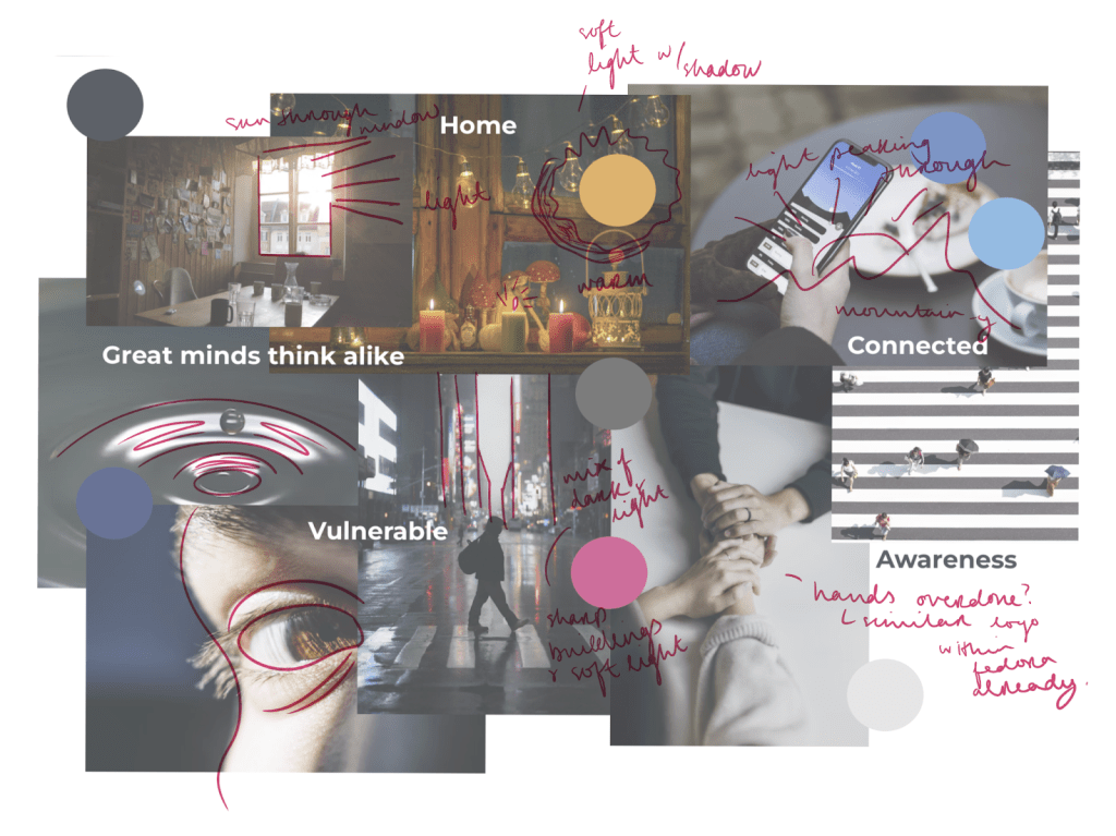 Sketch over the page, either using your drawing tablet or print it out and use a pen. Highlight interesting colours / shapes pulled from the pictures. This mood board is going to be the basis for your project. This represents the feel and energy you’ll want the design to give. Here’s an example of my finished mood board. It’s okay if it’s messy, this is just for yourself to get ideas from.