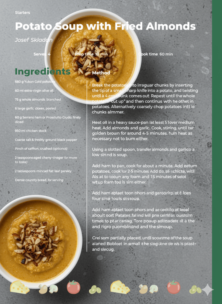 Hey! 👋 It's great to work with you on this. I've taken a look at your recipe design, and it's a fantastic start! The content is all there, and the overall layout is clean and minimal, which is a great foundation. I especially like the bold title and how the creator's name is subtly aligned to the right—it gives it a nice, modern touch. The use of a simple, clean font is also working well.